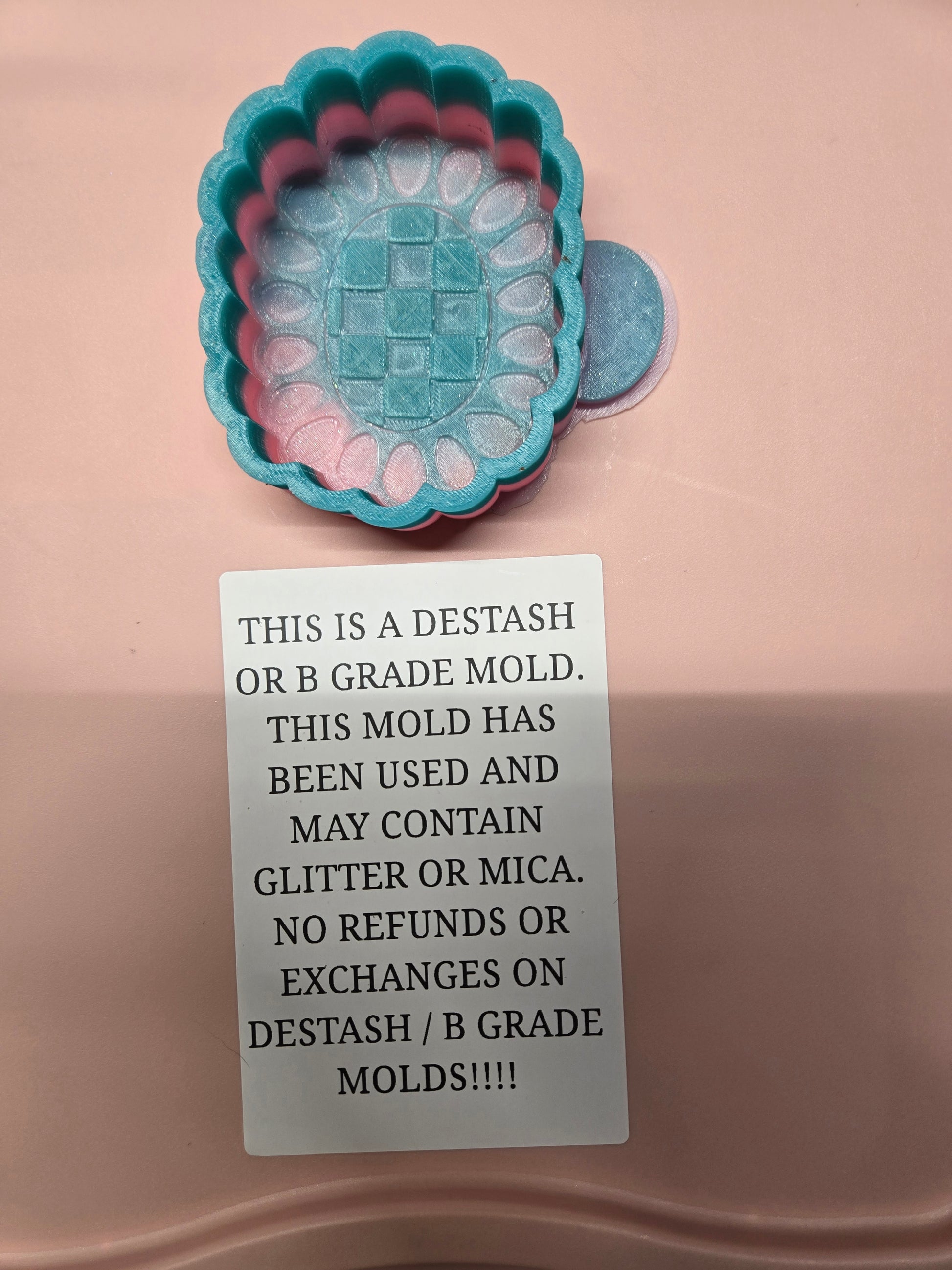 DESTASH MOLDS HAVE BEEN USED. THEY MAY COME DISCOLORED, UNWASHED, ETC. THERE ARE ABSOLUTELY NO REFUNDS ON DESTASH ITEMS.